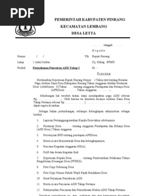 Penerbitan surat perintah pencairan dana deskripsi layanan biaya layanan waktu layanan sesuai dengan keputusan direktur jenderal perbendaharaan nomor kep 66 pb 2013 tanggal 8 april 2013 tentang standar. Contoh format surat pengajuan menulis surat pengajuan atau permohonan memang akan jauh lebih mudah jika sudah memiliki format surat pengajuan tersendiri. Apakah contoh format surat permohonan pencairan dana desa ini membantu anda. Produk layanan yang dikeluarkan dari prosedur diatas berupa sp2d.