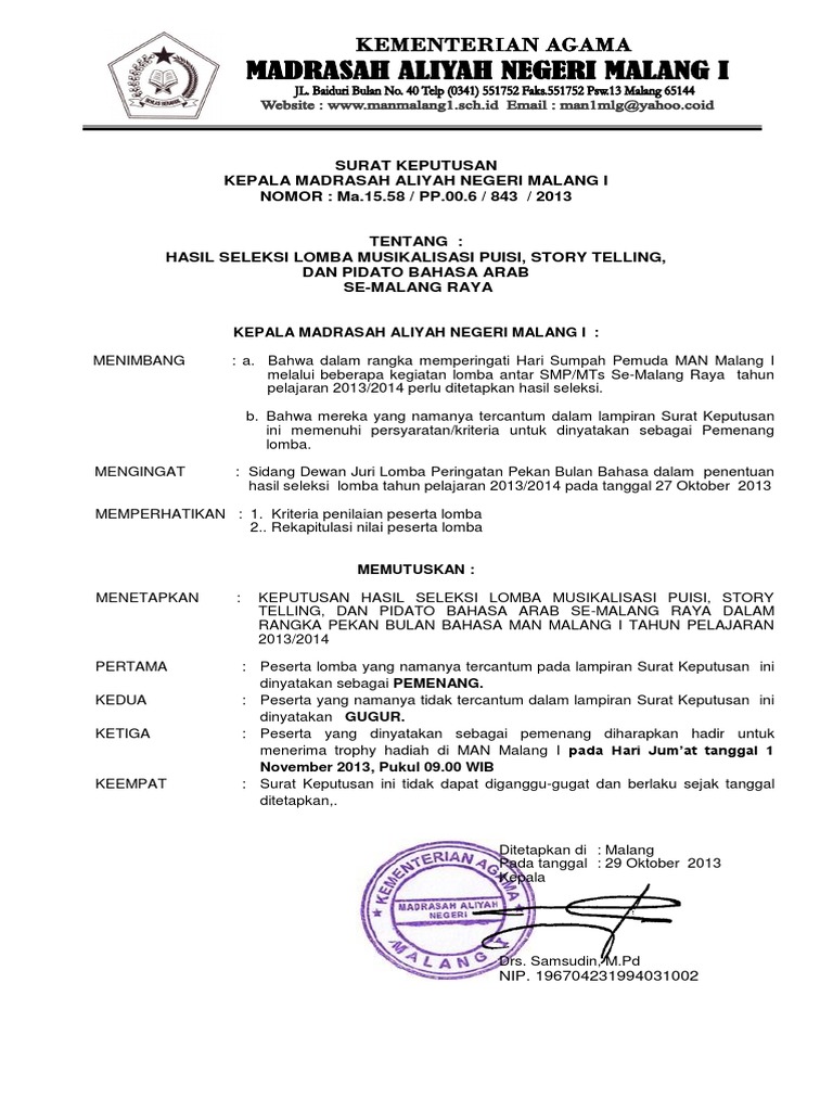 Semoga bermanfaat dan mampu menambah wawasan para pembaca sekalian baik itu mengenai pengumuman khususnya maupun bahasa indonesia pada umumnya. Untuk lebih jelasnya mengenai lampiran sk direktur jenderal pendidikan islam no. Cabang dan kategori lomba. Contoh surat keputusan surat keputusan adalah surat resmi yang penting yang dikeluarkan oleh instansi formal seperti sekolah organisasi instansi pemerintah dan pihak pihak lain sebagai pemberi keputusan.