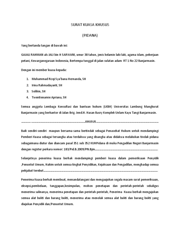Contoh Surat Kuasa Khusus Perdata Surat Kuasa Surat Hukum Pidana