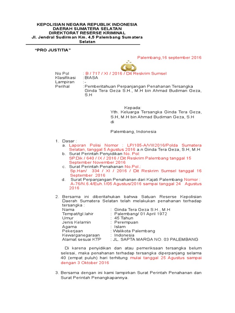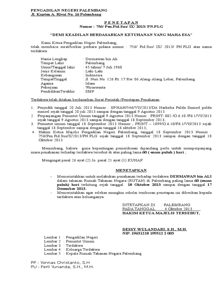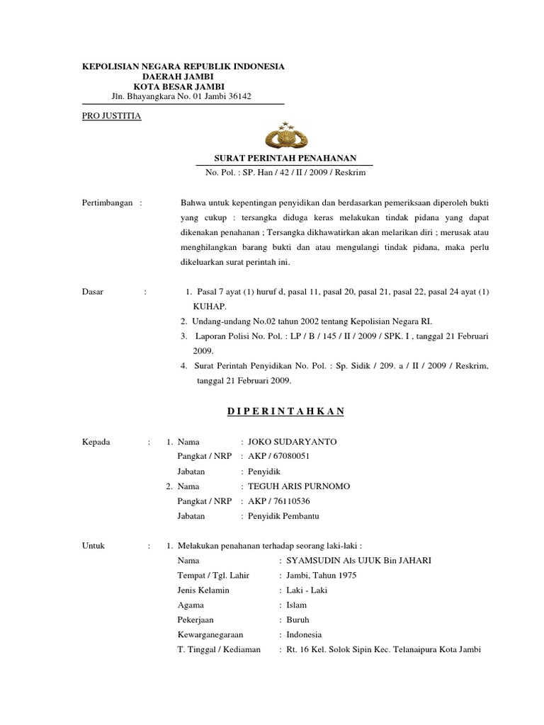 Contoh surat perintah penahanan. Apabila dalam tingkat banding maka lamanya penahanan telah sama dengan pidana yang dijatuhkan pengadilan negeri maka ketua pengadilan negeri dapat mengeluarkan dari tahanan atas izin ketua pengadilan tinggi. Han 1 517 vi 2008 reskrim pertimbangan. Surat perintah penahanan no mor. Berikut ini adalah contoh contoh surat penangguhan penahanan yang dapat dijadikan sebagai referensi.