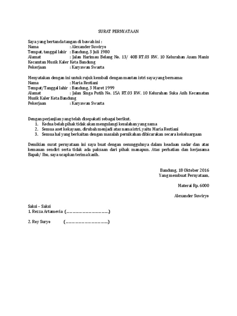 Contoh Surat Pernyataan Rujuk Kembali Dengan Perjanjian 1