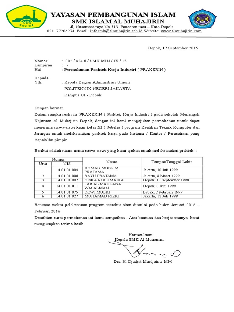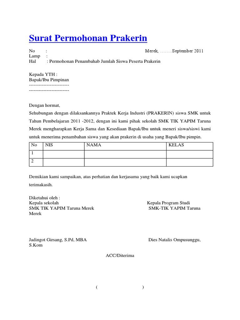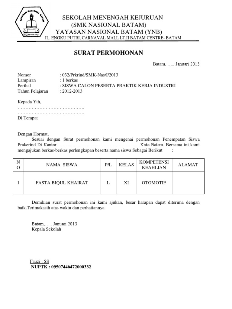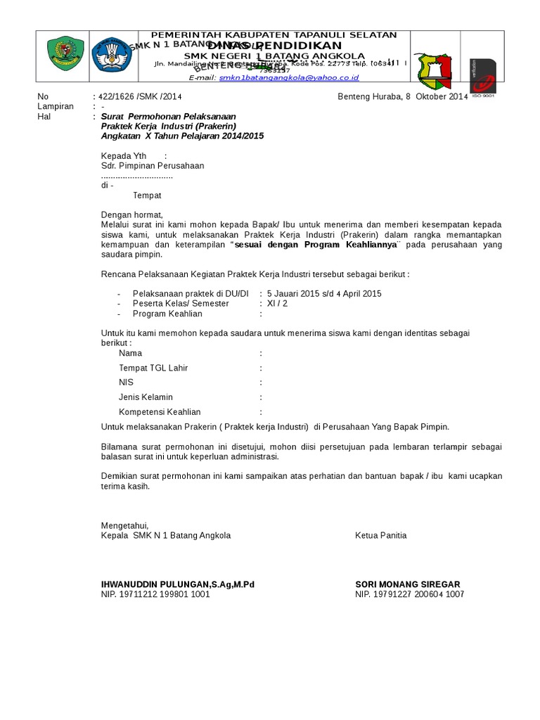 Doc Contoh Surat Permohonan Praktik Kerja Industri Smk Ario Fajri Academia Edu