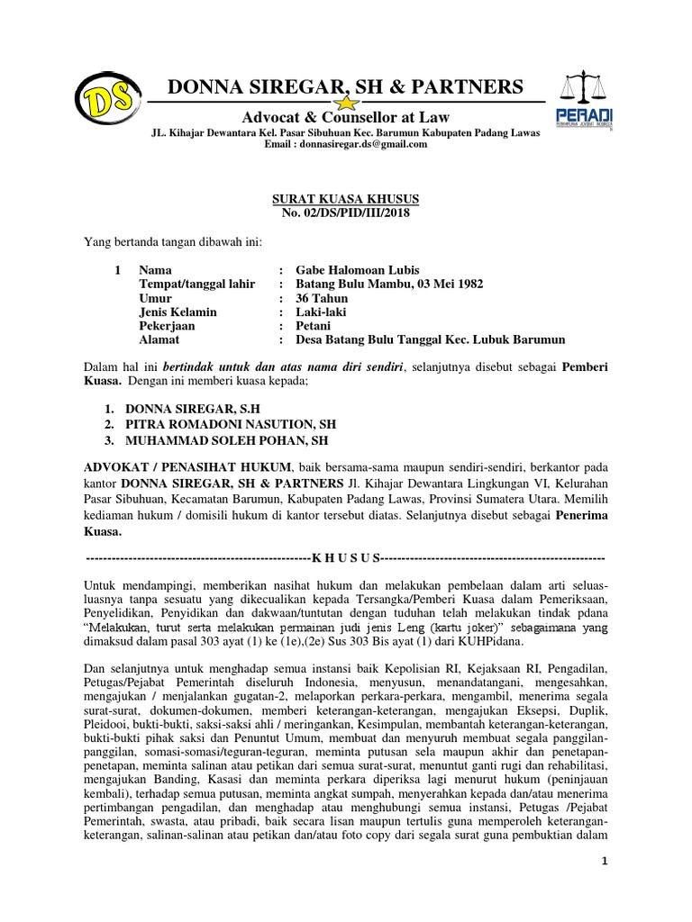 Dalam hal ini bertindak untuk dan atas nama pt. Sebagai direktur beralamat di dalam hal ini telah memilih tempat kediaman hukum di kantor kuasanya tersebut di bawah ini selanjutnya sebagai pemberi kuasa. Karena termohon mengirimkannya spdp dengan begitu saja ke rumah kosong di wilayah mojokerto bunyi surat permohonan yang dibacakan tim kuasa hukum nurhadi cs. Pengertian surat kuasa khusus adalah kuasa yang diberikan oleh pemberi kuasa kepada penerima kuasa untuk kepentingan dan atas nama pemberi kuasa dalam hal hal yang terbatas khusus pada apa yang tertuang di dalam surat kuasa yang berupa tindakan yang dapat menimbulkan akibat hukum.