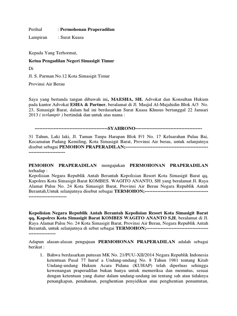 Contoh surat permohonan praperadilan tindak pidana perihal. Contoh contoh surat lainnya bisa anda baca baca di kategori lain misalnya contoh surat resain. Ada 3 unsur dari pengertian surat kuasa. Surat kuasa umum pemberian kuasa yang meliputi pelaksanaan segala kepentingan dari pemberi kuasa kecuali perbuatan hukum yang hanya dapat dilakukan oleh seorang pemilik pasal 1796 kuhperdata.