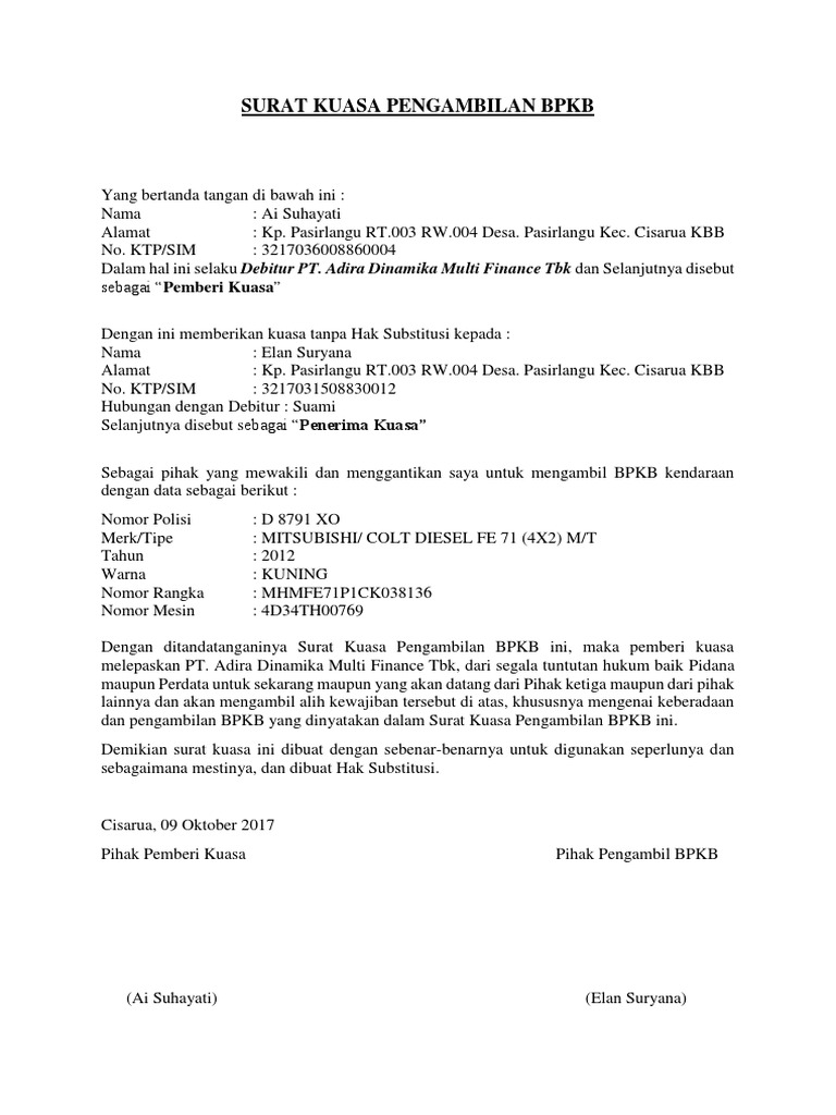 Contoh surat kuasa pengambilan bpkb motor penulisan surat kuasa juga harus runtut dan jelas sesuai aturan agar bisa disebut surat kuasa yang sah. Surat kuasa ini isinya mirip dengan surat kuasa yang seperti biasanya yang membedakan adalah isinya yang menyatakan bahwa pihak kedua diberikan kuasa untuk mengambilkan surat bpkb. Contoh surat kuasa pengambilan bpkb motor dan mobil di kantor leasing adira finance baf samsat fif bca finance lengkap dengan syarat pengambilan bpkb contoh surat kuasa pengambilan bpkb sudah menjadi kewajiban dan keharusan jika dokumen bpkb motor atau mobil yang sudah jadi untuk diambil. Berikut ini adalah surat kuasanya 1.