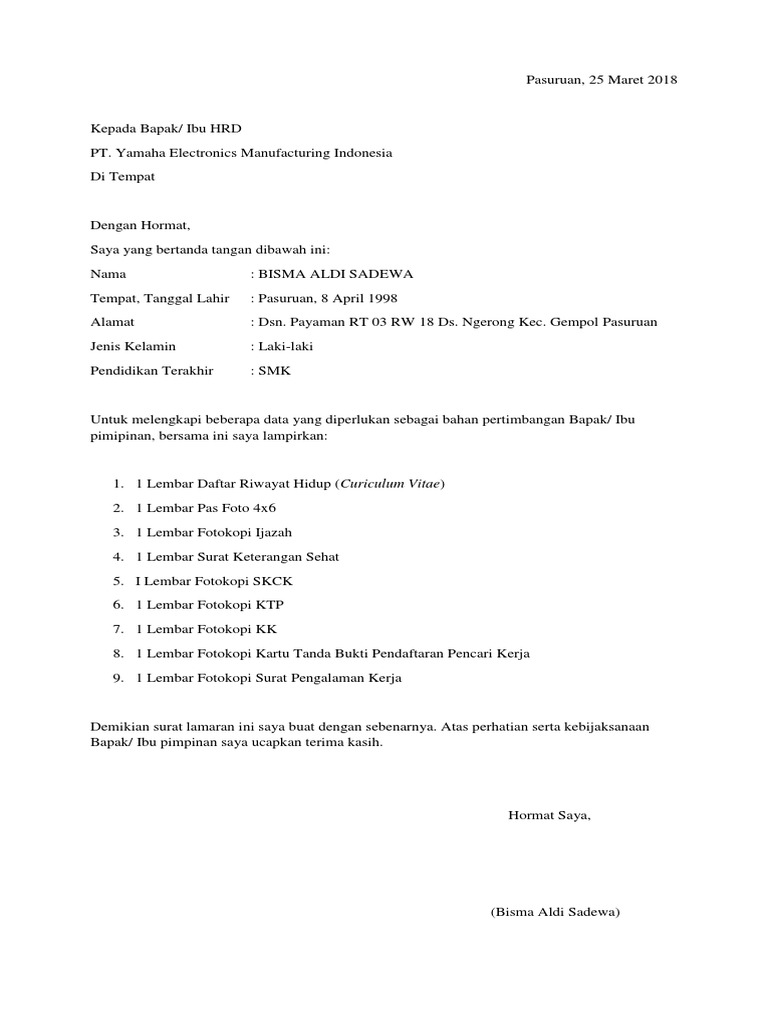 Contoh Surat Contoh Surat Lamaran Kerja Pt Yamaha Karawang