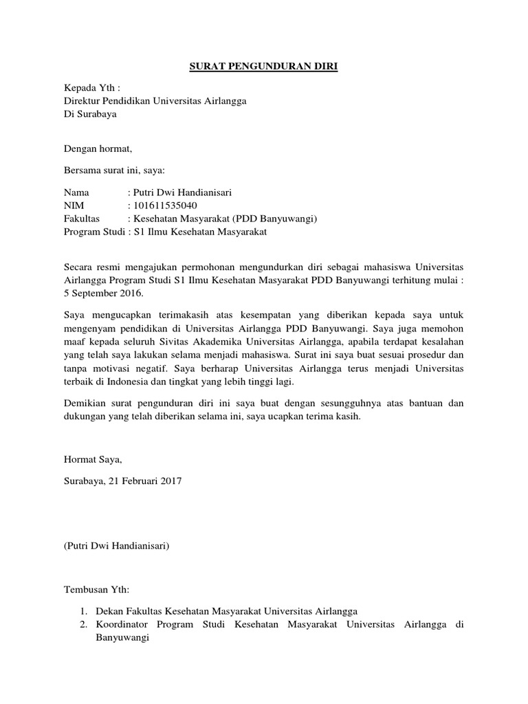 I lembar identifikasi universitas brawijaya un10 b11 hk 01 02 a 14 2 05 2018 pengajuan pengunduran diri mahasiswa secara online ke 1 halaman 1 dari 5 pengajuan. 5 contoh surat pengunduran diri mahasiswa dan dosen seperti saat resign dari pekerjaan mengundurkan diri dari bangku perkuliahan baik sebagai mahasiswa ataupun dosen juga memerlukan yang namanya surat. Surat pengunduran diri mahasiswa umum diajukan oleh mahasiswa yang bersangkutan. Contoh surat pengunduran diri kerja untuk mendownload gambar diatas dalam format ms word silahkan klik link berikut.