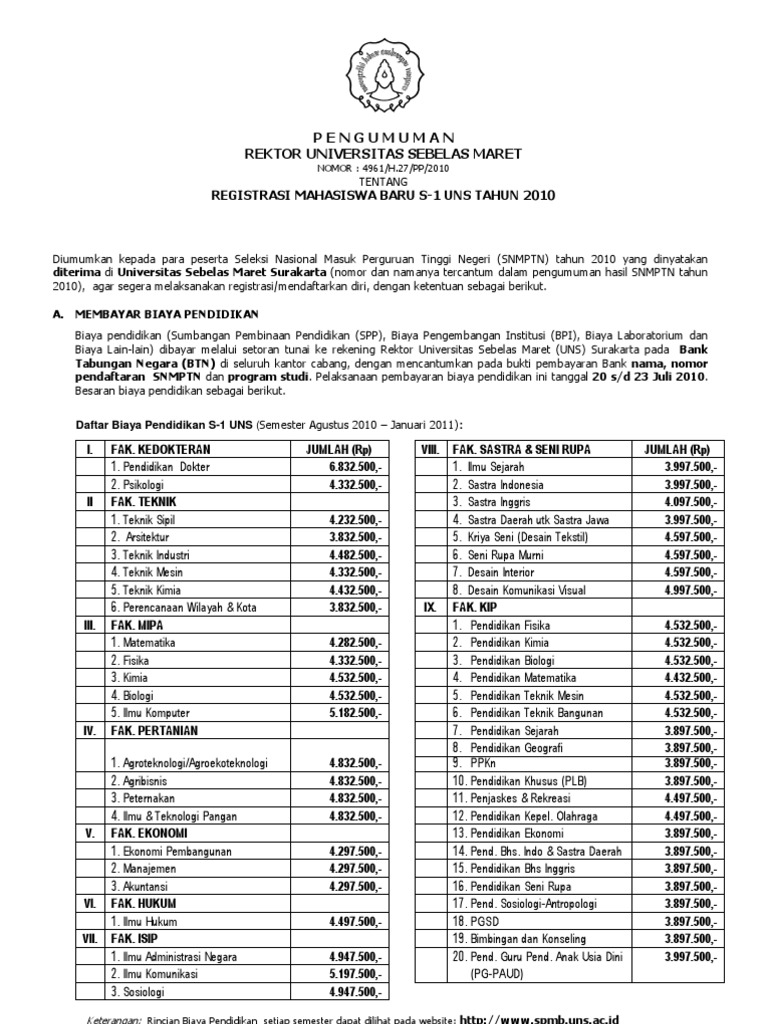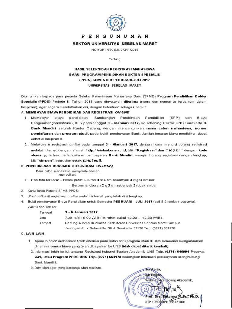 Prosedur pengunduran diri dan penarikan biaya pendidikan bagi calon mahasiswa baru yang diterima di program lain di lingkungan uns tahun 2017 oleh admin pada 2017 07 13 universitas sebelas maret.