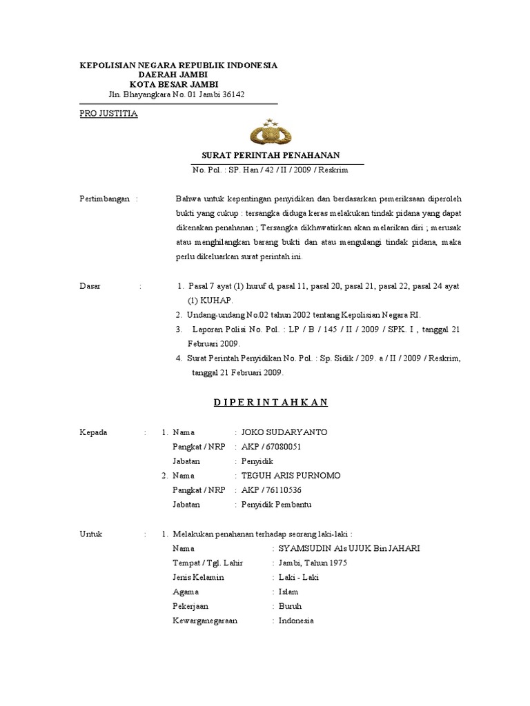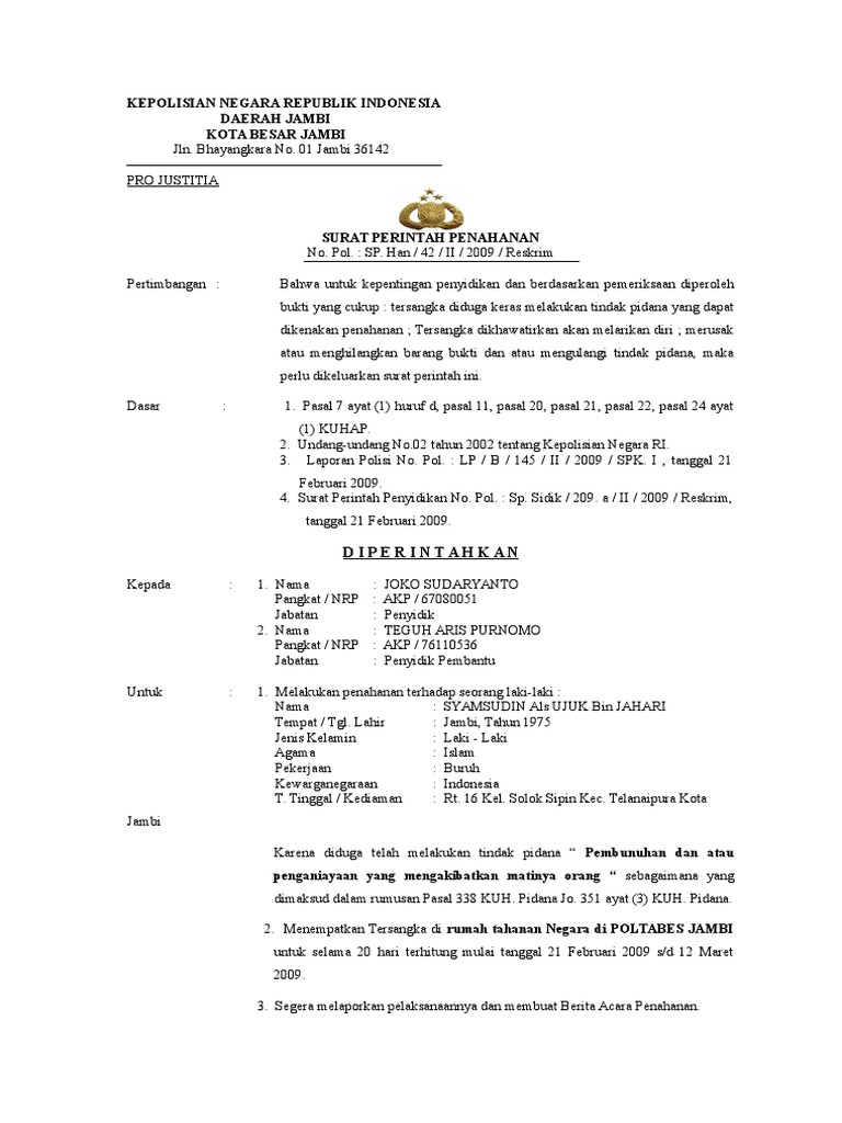Surat perintah penahanan kota. 8 tahun 1981 tentang hukum acara pidana kuhap yang berbunyi a tas permintaan tersangka atau terdakwa penyidik atau penuntut umum atau hakim sesuai dengan kewenangan masing masing dapat mengadakan penangguhan penahanan dengan atau tanpa jaminan uang atau. Bukti setoran tersebut dibuat dalam rangkap tiga dan berdasarkan bukti setoran tersebut maka instansi yang menahan mengeluarkan surat perintah atau surat penetapan penangguhan penahanan 2. Contoh surat penangguhan penahanan kalian perlu tahu bahwa surat permohonan merupakan surat yang menyatakan permohonan atau permintaan antara satu pihak dengan pihak yang lainnya. Contoh surat perintah bagi anda yang sudah bekerja dan memiliki jabatan yang tinggi mungkin saja anda akan membutuhkan penggunaan surat perintah untuk ditujukan kepada bawahan anda.