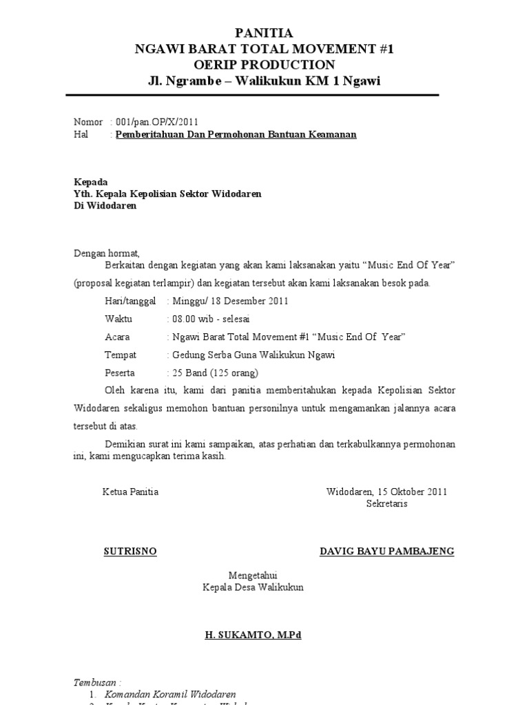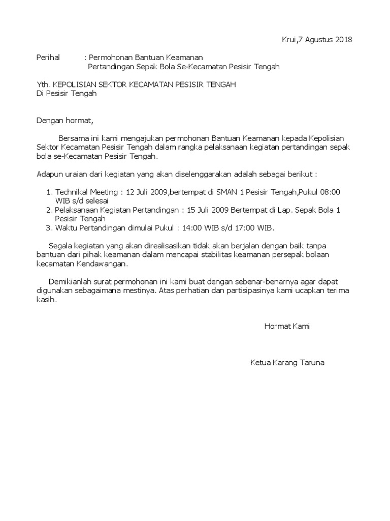 Surat permohonan bantuan keamanan kepolisian. Berikut detail informasi tentang contoh surat permohonan bantuan keamanan kepolisian. Segala kegiatan yang akan direalisasikan tidak akan berjalan dengan baik tanpa bantuan dari pihak keamanan dalam mencapai stabilitas keamanan persepak bolaan kecamatan kendawangan. Contoh surat bantuan keamanan kepolisian untuk kegiatan kemah pramuka friday august 4 2017 add comment edit bantuan keamanan sangat penting sekali ketika sekolah gudep pangkalan gerakan kepramukaan akan menyelenggarakan kegiatan perkemahan dengan tujuan meningkatkan kedisiplinan dalam ruang lingkup kegiatan kepanduan keparamukaan. Contoh surat permintaan bantuan pengamanan senin 29 februari 2016 makassar 0 3 nopember 20 nomor.