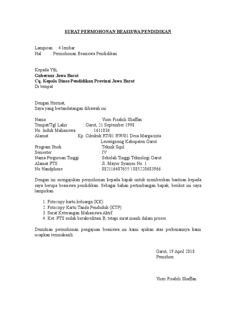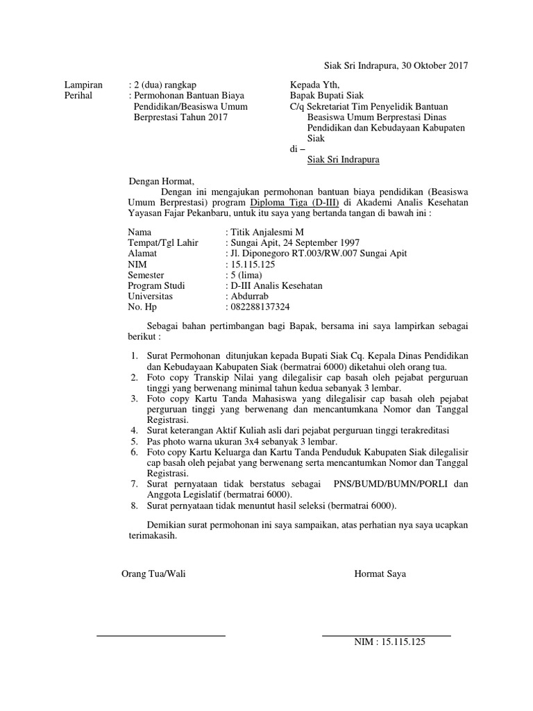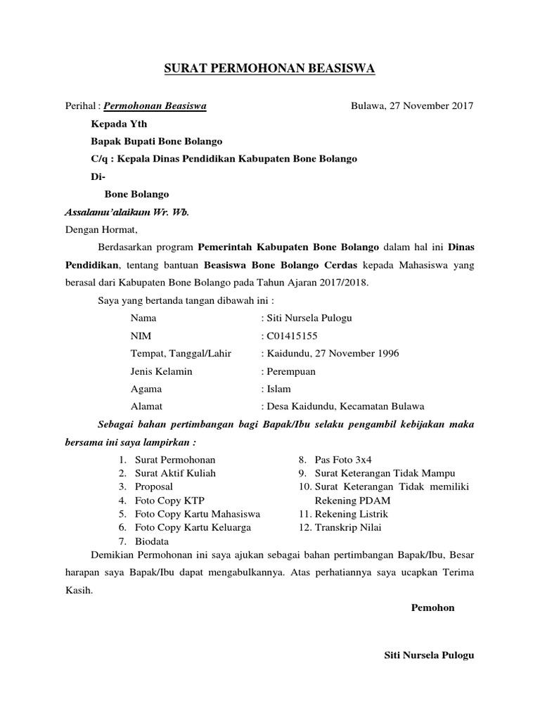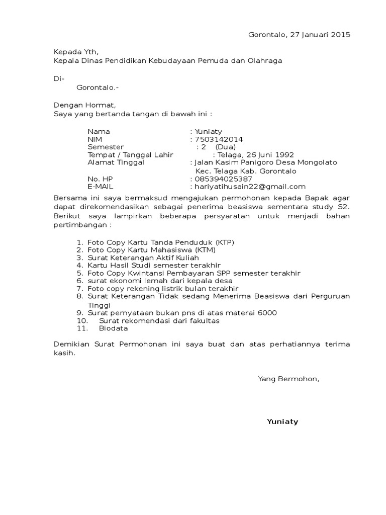 Telaga said talang ubi tim talang ubi penukal abab lematang ilir sumatera selatan 31211. Surat pernyataan tidak sedang menerima beasiswa dari pihak lain rekening listrik demikian permohonan ini saya ajukan besar harapan saya untuk terpilih sebagai penerima bantuan biaya pendidikan dari pemerintah kabupaten malang tahun 2018. Demikianlah surat permohonan ini saya buat dengan sebenarnya. Demikian surat permohonan penguji eksternal ini kami sampaikan atas kerjasamanya kami sampaikan terima kasih.