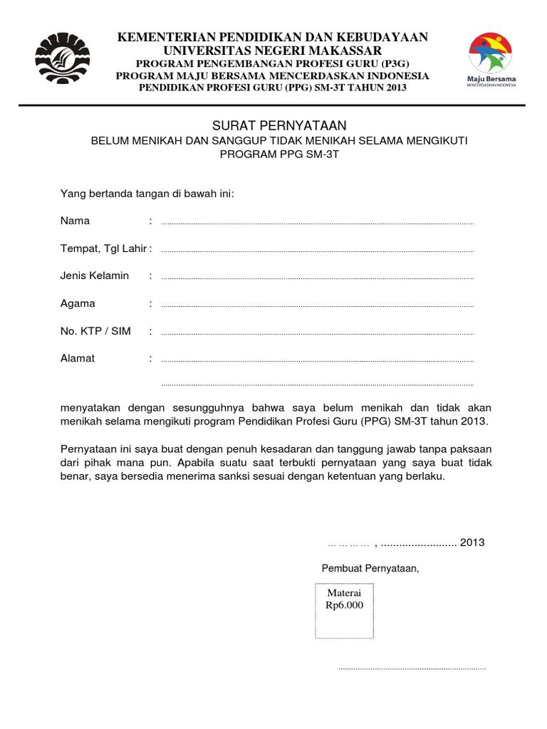 Surat Pernyataan Belum Menikah Bermaterai 6000
