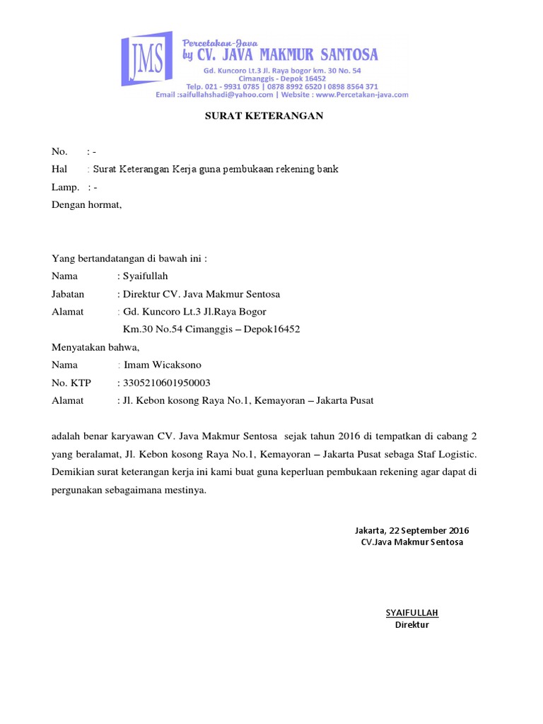 Contoh surat keterangan kerja ada berbagai format yang lazim dipakai dalam pembuatan surat keterangan kerja untuk membuka rekening baru di bank. Contoh contoh surat keterangan kerja untuk pembuatan rekening biasanya dibutuhkan jika kita ingin membuat rekening bank sedangkan kita tidak memiliki ktp yang sesuai. Dimana surat pernyataan untuk calon pegawai negeri sipil memang berguna untuk menyatakan bahwa anda tidak pernah dipecat pendidikan sesuai kesehatan baik dan juga tidak pernah melakukan kejahatan. Surat referensi pembukaan rekening bank.