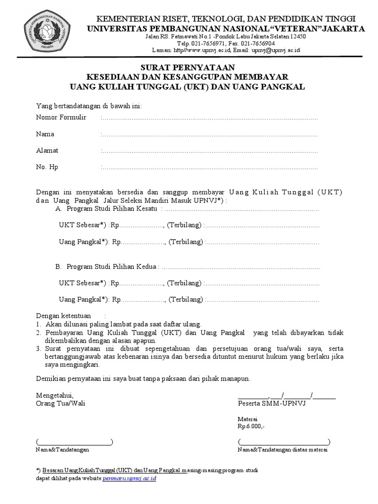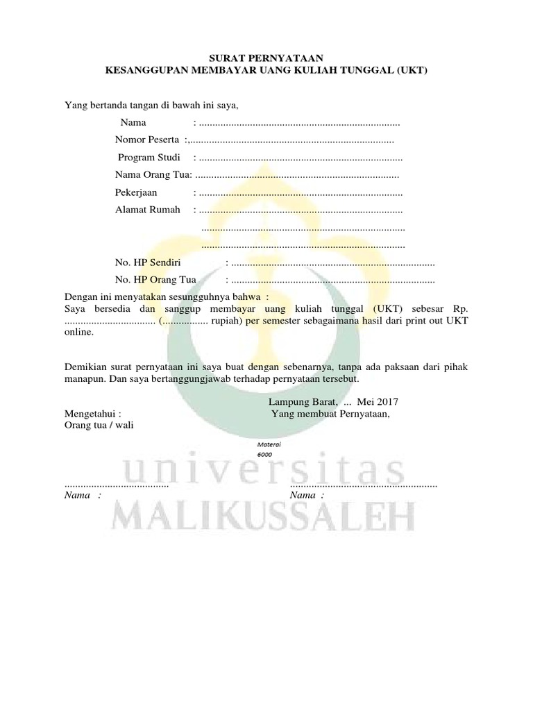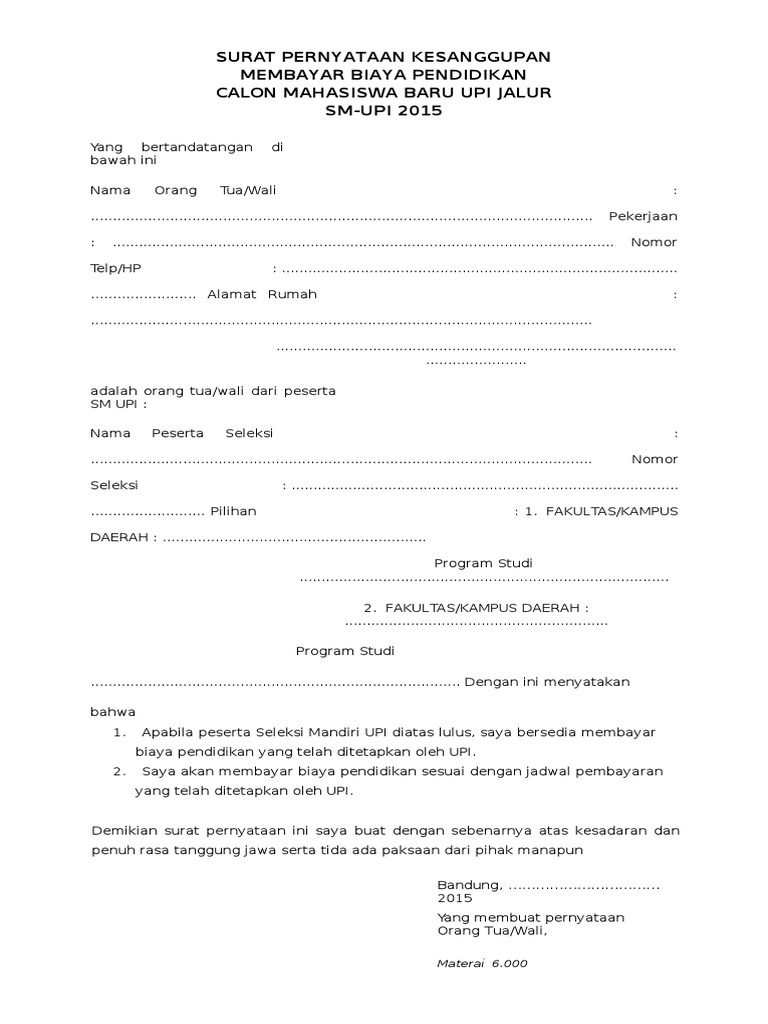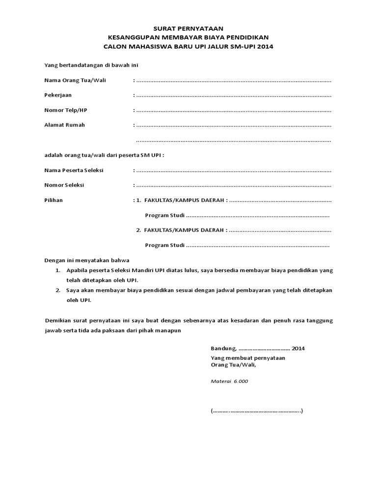 Surat pernyataan kesanggupan pembayaran kuliah. Surat pernyataan pembayaran uang kuliah tunggal. Jika diperlukan anda juga bisa mendowload surat perjanjian doc format word dalam ukuran a4 dan f4. Surat pernyataan kesanggupan membayar biaya pendidikan calon mahasiswa baru upi jalur sm upi 2014 yang bertandatangan di bawah ini nama orang tua. Contoh surat pernyataan kesanggupan membayar hutang reviewed by grobakz on sunday may 3rd 2015.