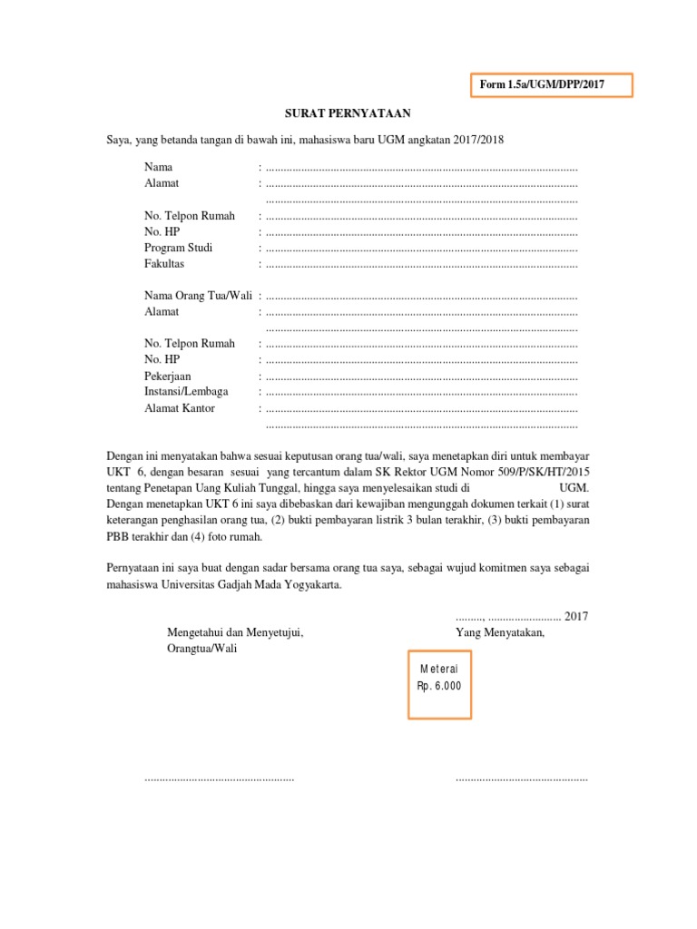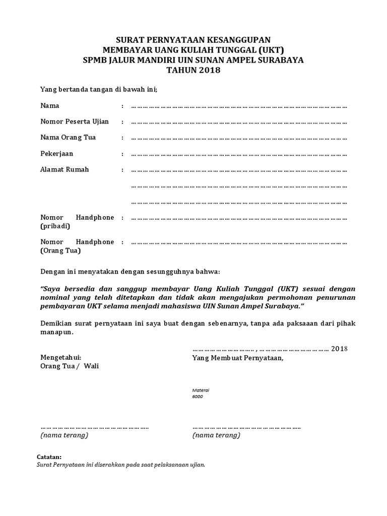 Ada banyak contoh surat pernyataan yang biasanya banyak digunakan mulai dari surat pernyataan belum menikah surat pernyataan diri surat pernyataan menyesal sampai dengan surat pernyataan kesanggupan. Namun beberapa orang mungkin saja memilih untuk. 6000 surat pernyataan kesanggupan membayar uang kuliah tunggal ukt spmb jalur mandiri uin sunan ampel surabaya dengan ini. 15 contoh surat pernyataan kesanggupan untuk berbagai keperluan dalam berbagai kasus dan keperluan seseorang mungkin saja memerlukan dan harus menulis surat pernyataan.