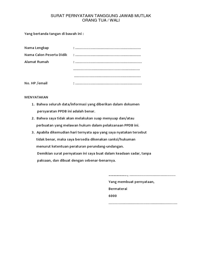 Contoh surat pernyataan orang tua setiap anak tentu akan menjadi tanggung jawab orang tua. Nama lengkap orang tua. Salah satu persyaratan yang harus dilengkapi saat melakukan pendaftaran ppdb adalah surat pernyataan tanggung jawab mutlak dari orang tua wali calon siswa. Misalnya saja dalam melamar.