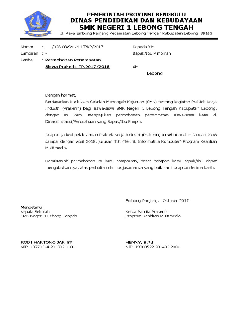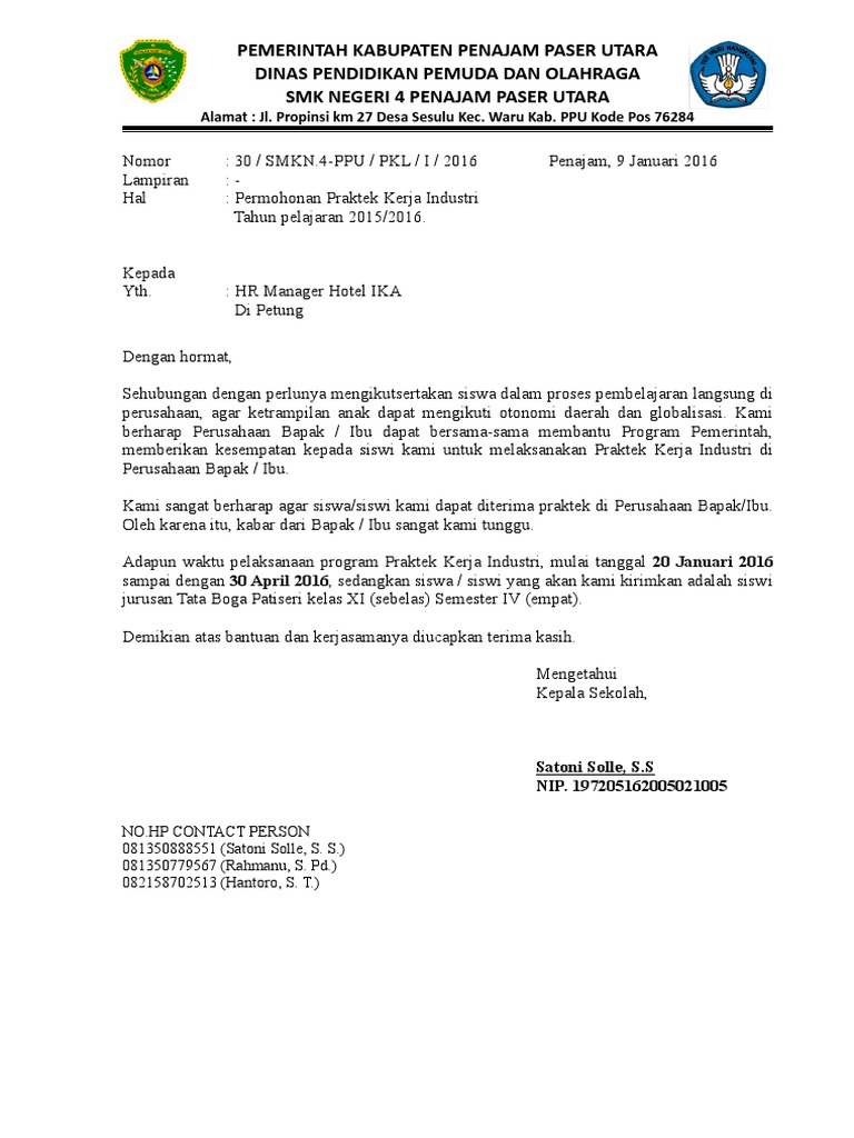 Surat resmi permohonan praktek kerja industri. Demikian surat permohonan izin praktek kerja industri ini kami sampaikan atas perhatiannya kami ucapkan terima kasih. Surat keluar dan surat masuk adalah pekerjaan yang biasa kita lakukan selaku staff tata usaha pada kesempatan kali ini admin akan mencoba membagikan contoh surat keluar yaitu surat pengajuan praktek kerja industri. Silahkan disimak saja contoh surat lamaran kerja lapangan berikut ini semoga dapat menambah referensi anda untuk membuat surat permohonan kerja praktek. Surat permohonan ini berisi bahwa siswa meminta izin kepada pihak industri bahwa dirinya ingin melaksanakan prakerin pada perusahaan tersebut.